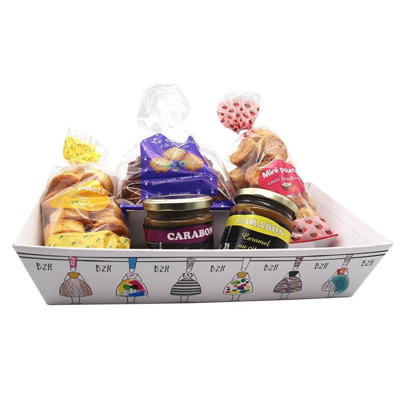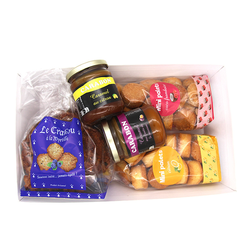 Présenté dans une élégante corbeille bigoudène au style chic, ce coffret réunit une sélection de douceurs artisanales aux inspirations fruitées. Laissez-vous séduire par le carabon passion, aux notes exotiques et ensoleillées, ainsi que par le carabon citron, subtilement acidulé et plein de fraîcheur.Ce panier est également composé de mini palets coco framboise, où la douceur de la noix de coco rencontre l’intensité du fruit rouge, et de mini palets citron, à la texture fondante et au goût délicatement zesté. Enfin, les crakou myrtille apportent une touche croustillante et fruitée, idéale pour varier les plaisirs.Un assortiment harmonieux de biscuits artisanaux qui séduira les amateurs de saveurs fruitées, alliant authenticité, qualité et gourmandise. Parfait pour un moment de partage ou pour faire plaisir avec un coffret aussi beau que savoureux.